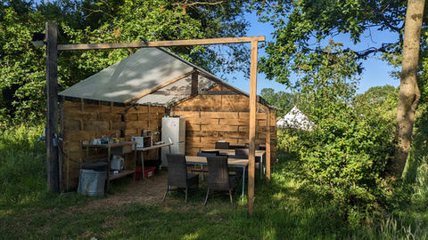 “Glamorous” – We have two sizes of bell tent to choose from: Our Standard 5m bell tents are furnished with 4’6” double bed, rugs on the floor, table and chairs, electric lighting and sockets plus everything you need to make yourself a cuppa - a true glamping experience. Our Deluxe 6m bell tents have a king size bed and additional furniture and décor for that added sense of luxury. All bell tents come with their own fire pit / BBQ and outdoor table and chairs. New for 2025 - we have a traditional shepherd's hut "Niamh's Hideaway" set in a secluded spot on the edge of the water meadow. Here you can escape the pressures of life and relax in the beautiful surroundings of the nature reserve that borders the campsite.
